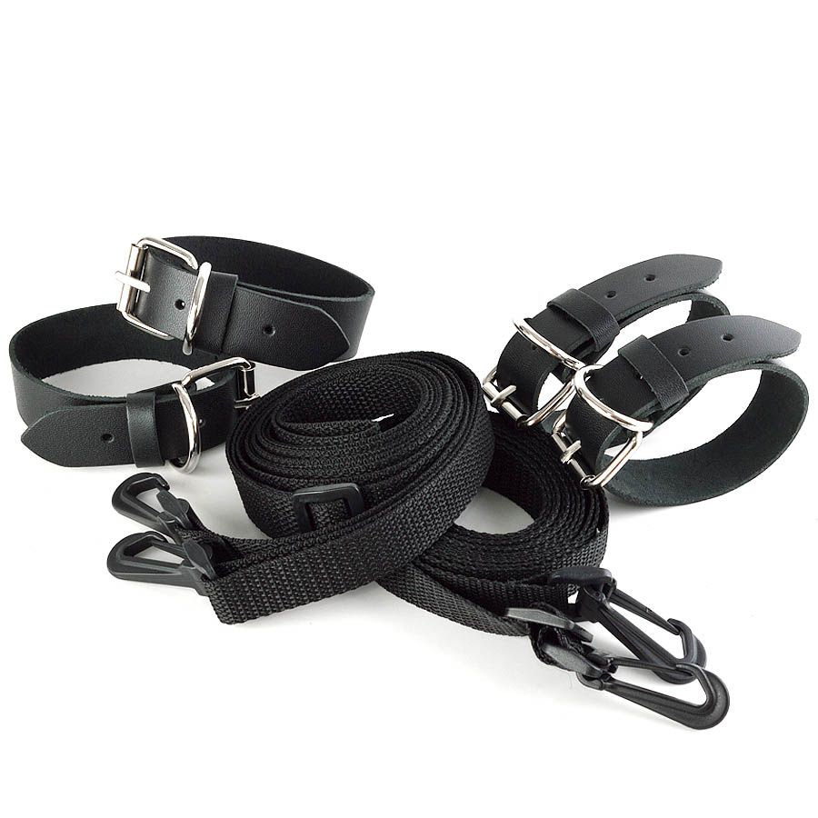В комплект входят наручники, оковы и две растяжки на кровать. Наручники и оковы крепятся к ремешкам при помощи прочных пластиковых карабинов. Длина каждого ремешка - 2,7 м.