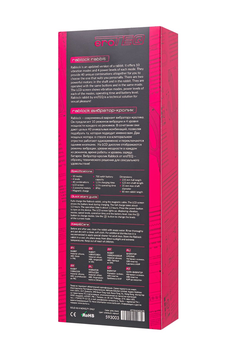 Традиционный вибратор-кролик Rablock от eroTEQ создан с заботой об интимном благополучии. Два мощных мотора, работающих вместе, обеспечивают бескомпромиссную эротическую стимуляцию. Кролик запрограммирован 10 режимами вибрации и 4 уровнями мощности. Сочетая эти параметры легко найти идеальный вибрационный рисунок – 40 уникальных комбинаций, чтобы подарить вам максимум удовольствия и неповторимый оргазм. Погружная часть вибратора обладает естественным изгибом и выразительной головкой, созданной для максимальной стимуляции зоны G. Клиторальный отросток с двумя ушками имеет прямой контакт с клиторальной зоной и позволяет экспериментировать легкими дразнящими прикосновениями или максимально тесным контактом. Возможности Rablock позволяют вам наслаждаться моментами интимного блаженства с полной уверенностью и комфортом. Три кнопки на корпусе с понятными обозначениями обеспечивают простое и комфортное управление вашим удовольствием. Революционная концепция Rablock начинается с LCD экрана, который предоставляет полный контроль над всеми функциями – режимами вибрации, временем работы и уровнем заряда батареи. Гладкая, бесшовная поверхность из высококачественного силикона не только дарит нежность, но и гарантирует абсолютную безопасность при каждом прикосновении. Сочетание соблазнительного розового оттенка и изысканного дизайна приносит удовлетворение и радость! Впечатляйтесь функционалом игрушки даже в душе, благодаря водонепроницаемой технологии IPX6, обеспечивающей простоту в уходе. Рекомендуется использовать лубрикант на водной основе. Время зарядки 1,5 часа для быстрого подзарядки. Время работы 1,5 часа для долгих сессий удовольствия. Рабочая длина - 12,5 см.