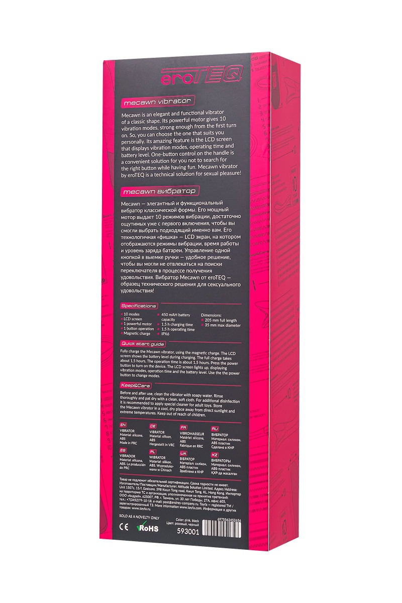 Вибратор Mecawn от eroTEQ – настоящее произведение искусства интимной технологии, гармонично сочетающее элегантность и функциональность. С его естественным изгибом и выразительной головкой, созданными для максимальной стимуляции зоны G, вы окунетесь в мир непередаваемого удовольствия. Длина обеспечивают идеальное попадание в самое чувствительное место. Гладкая, бесшовная поверхность из высококачественного силикона не только дарит нежность, но и гарантирует абсолютную безопасность при каждом прикосновении. Сочетание соблазнительного розового оттенка и изысканного дизайна приносит удовлетворение и радость! Впечатляйтесь функционалом игрушки даже в душе, благодаря водонепроницаемой технологии IPX6, обеспечивающей простоту в уходе. Рекомендуется использовать лубрикант на водной основе. Mecawn оснащен мощным двигателем и 10 режимами вибрации, каждый из которых продуман для постепенного возбуждения, готовя вас к невероятному оргазму. Мощь этого устройства ощутима уже с первых секунд использования. Революционная концепция Mecawn начинается с LCD экрана, который предоставляет полный контроль над всеми функциями - режимами вибрации, временем работы и уровнем заряда батареи. Управление вибратором – легко и интуитивно понятно, благодаря всего лишь одной кнопке, удобно расположенной в рукоятке. Ничто не отвлечет вас от наслаждения в этом лабиринте сексуальных удовольствий. Mecawn от eroTEQ – это не просто вибратор. Это воплощение новейших технологий в мире сексуального удовольствия! Рабочая длина - 14,5 см.